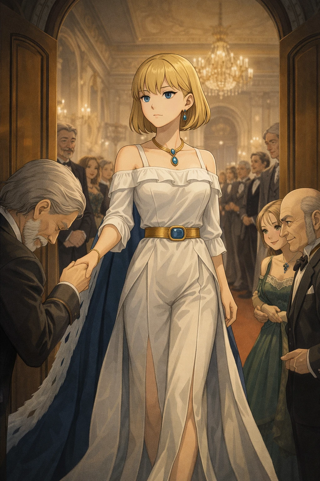 대리석 바닥 위, 푸른 자수가 놓인 드레스 자락이 흘러내리고 샹들리에의 빛이 부딪힌 유리잔들이 반짝이며 사람들의 웃음소리와 어우러진다. 마리아는 돌아가며 왕자, 젊은 귀족들과 춤을 추고, 무도회장 한복판에서 웃으며 빙그르르 회전한다.