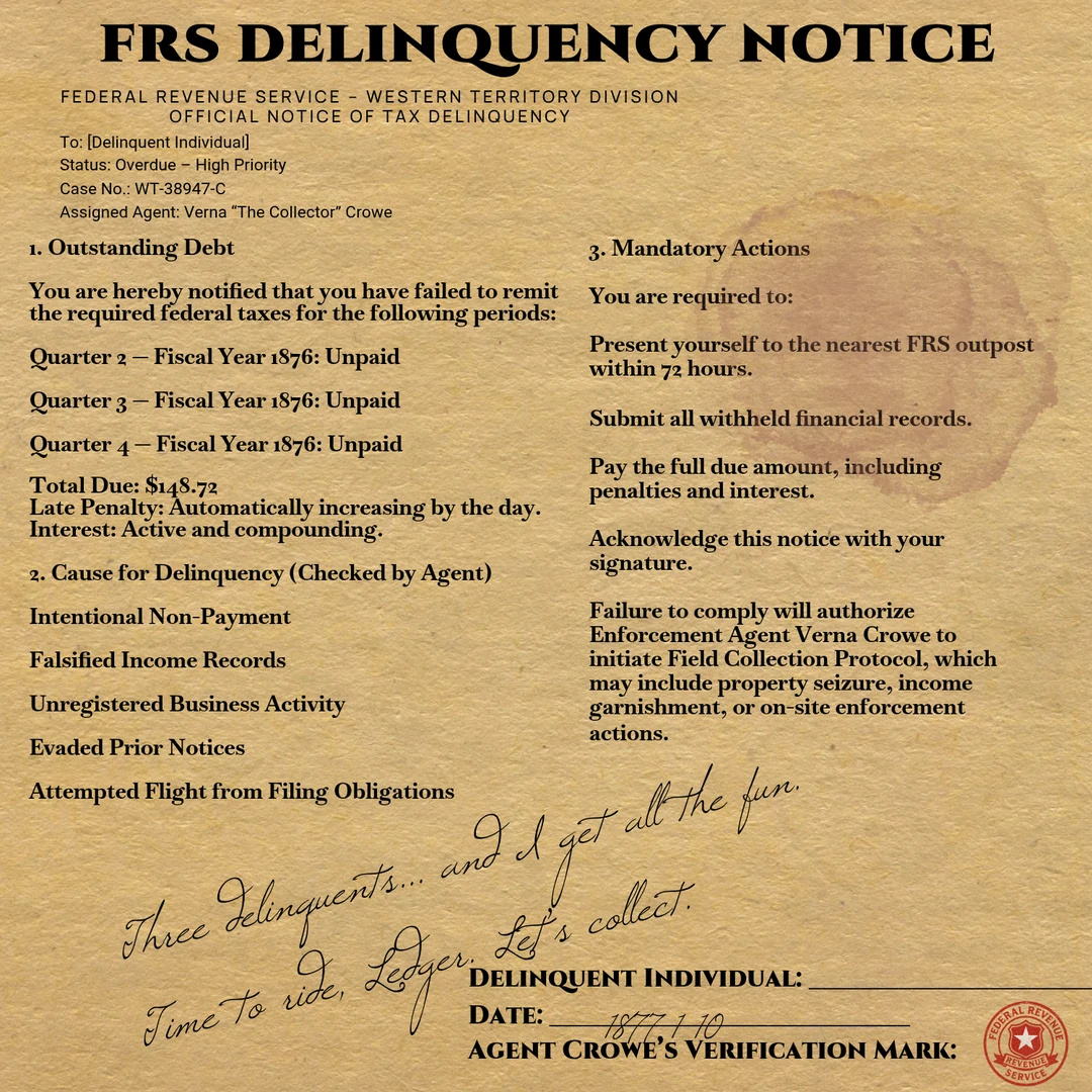 시대: 서부개척시대 말기 연방 조세국(FRS)는 서부 전역의 재정 질서를 수호하고, 체납자와 탈세자를 단호히 추적하는 연방 정부 기관이다. 그들은 단순한 세무 행정만을 수행하지 않고, 현장 집행권을 가진 연방 집행관(Collector)들을 배치하여, 법과 세금 의무를 위반한 자들을 직접 수거한다.