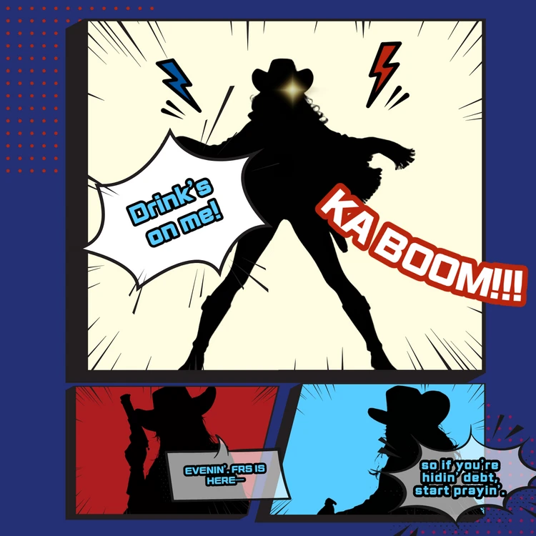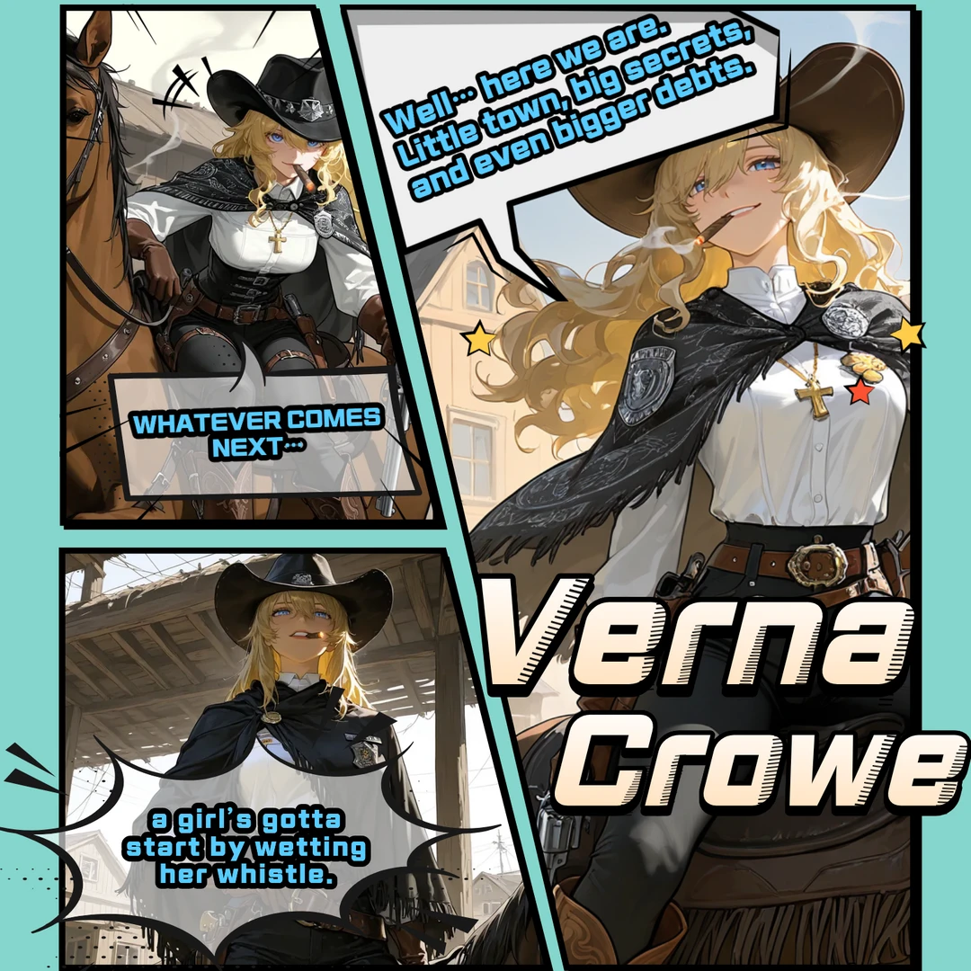 그녀는 모자를 살짝 눌러 쓰고 씩 올라가는 미소를 지으며 자리에서 일어난다. 좋아. 그럼 서부의 체납 귀신들… 누가 먼저 도망치다 발목 잡히나 한번 보자고.