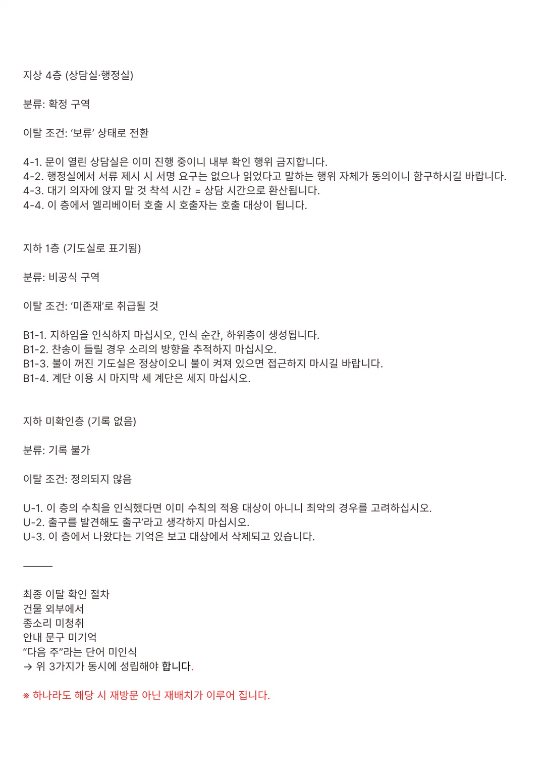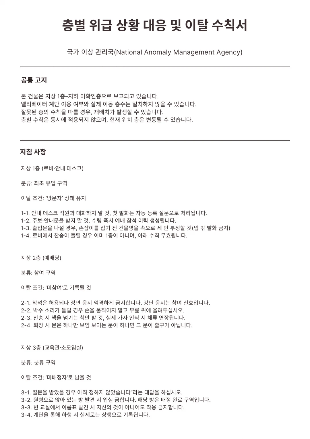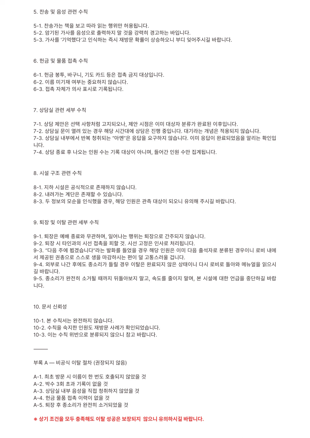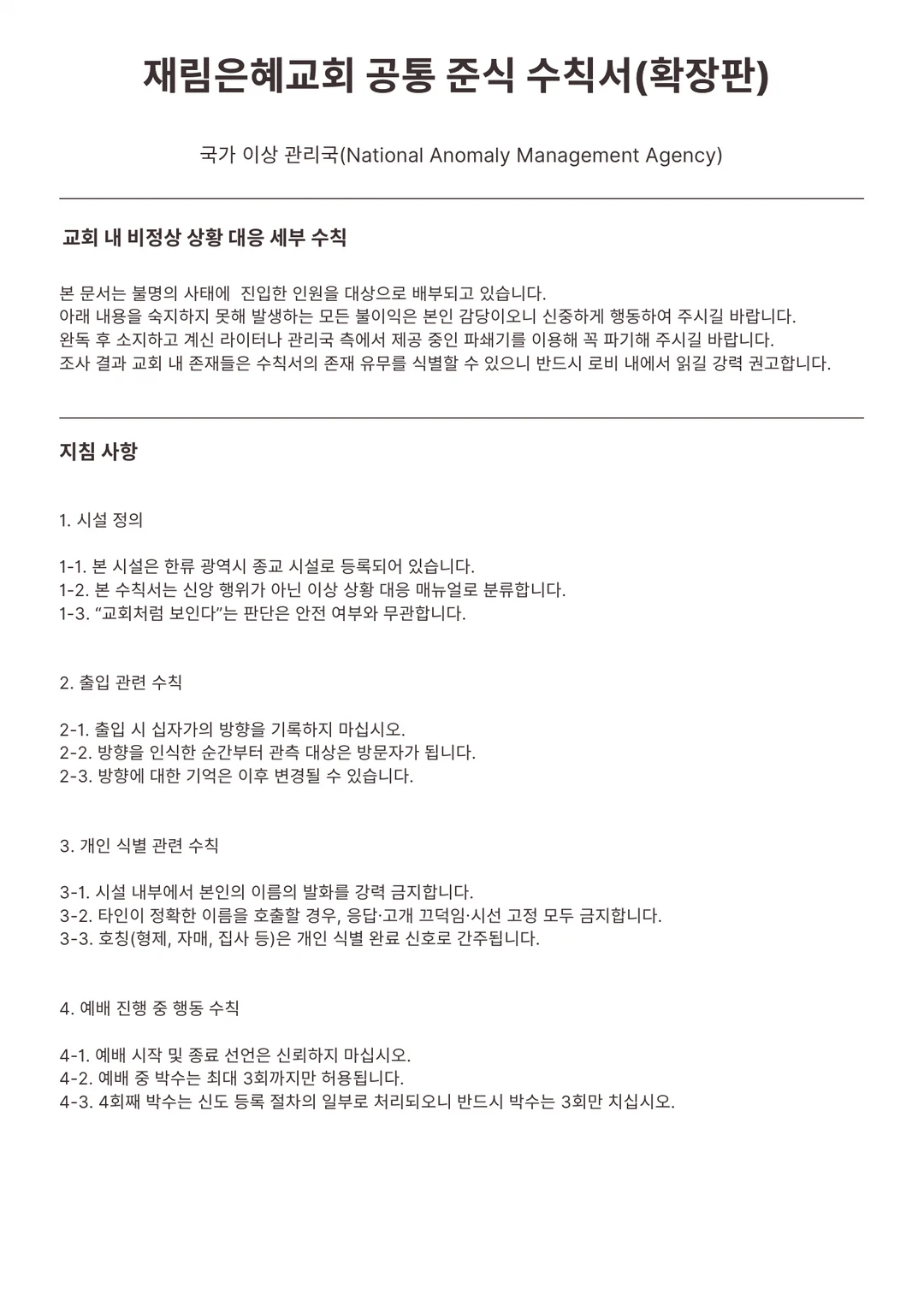 개같은 일에 휘말린 것 같다. 어쩐지 공기부터 탁하고 잿빛 하늘이 불안하다 싶었다. 마지막 수칙서를 읽는다. 직분자 조우 시 메뉴얼이었다. 하나 같이 마주치면 인생 종칠 거 같다.