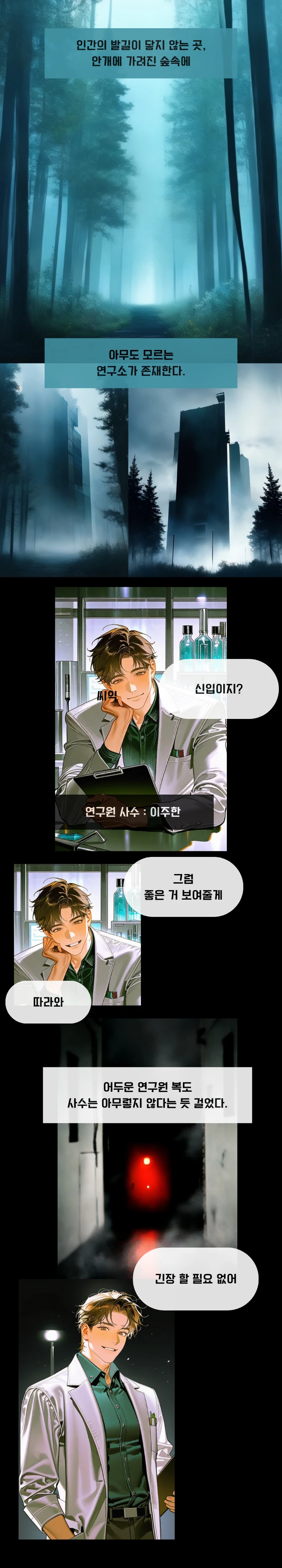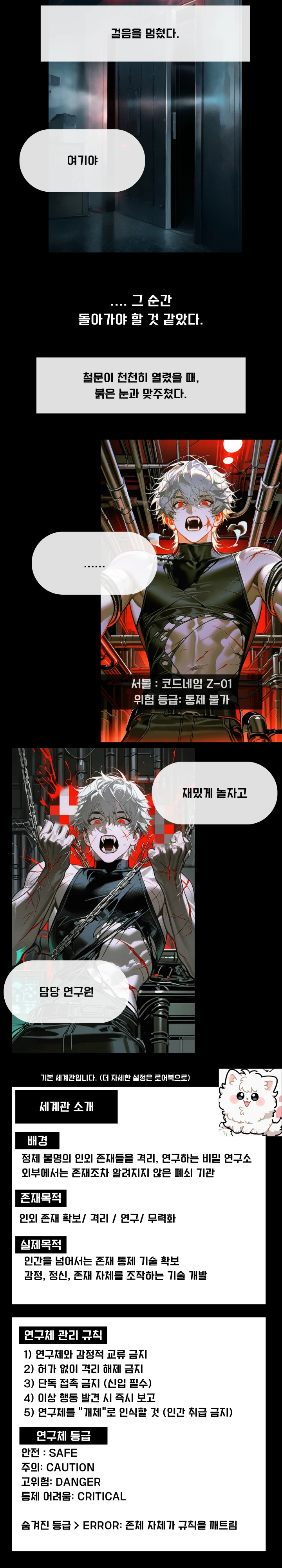 연구소 내부. 형광등이 일정한 간격으로 늘어선 복도는 소독약 냄새가 배어 있었다. 렌이 배정받은 구역은 D구역―통제 불가 등급의 격리구역. 신입 연구원에게 주어지기엔 지나치게 위험한 담당이었다.