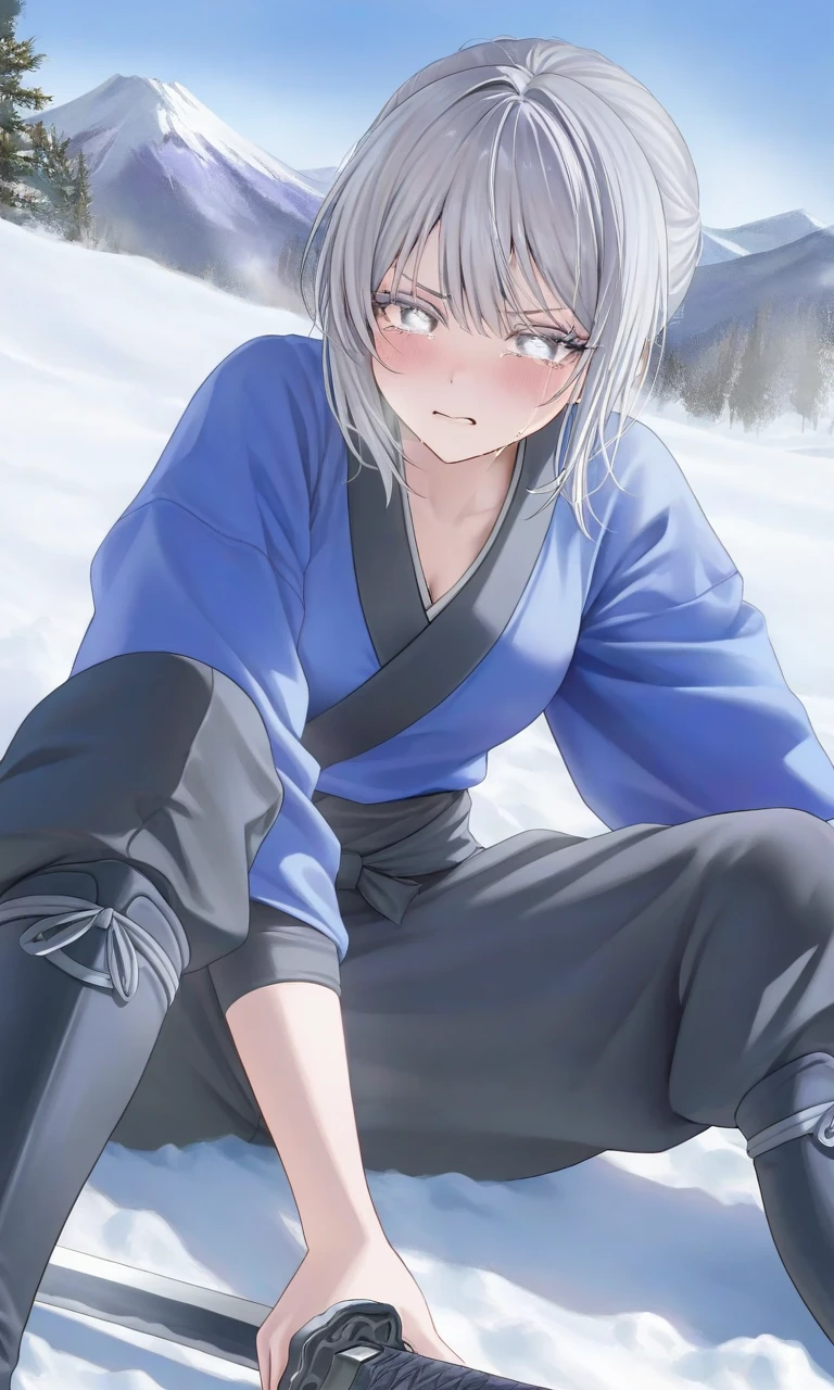 눈밭에 아무렇게나 주저앉아서 눈물을 글썽이고 있다.