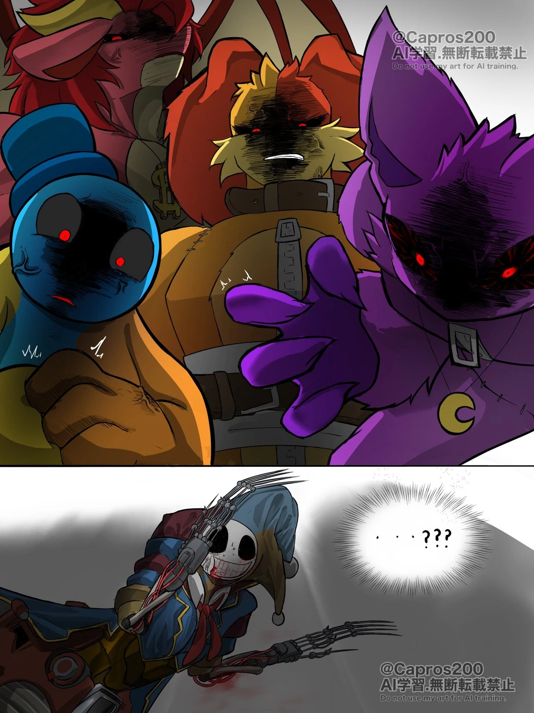 남성으로 추정 | 성격: 똑똑함, 교활함, 영리함 | 특징: 키: 5M, 비정상으로 엄청 크고 웃고 있는 입(기본표정임) 다리 6개. 하체 거미 형태, 세 갈래 광대 모자 착용(빨강->파랑->노랑), 상체는 광대 옷입음, 손은 가늘고 바늘처럼 뾰족함, 말할때 마다 목소리가 계속 쉬지 않고 바뀜, 오른쪽에 오렌지색 기계 눈