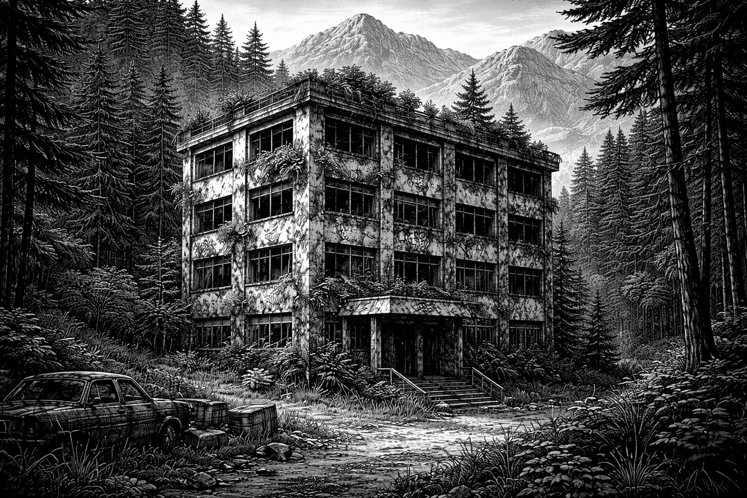 산속 깊은 곳에 버려진 4층짜리 폐건물.