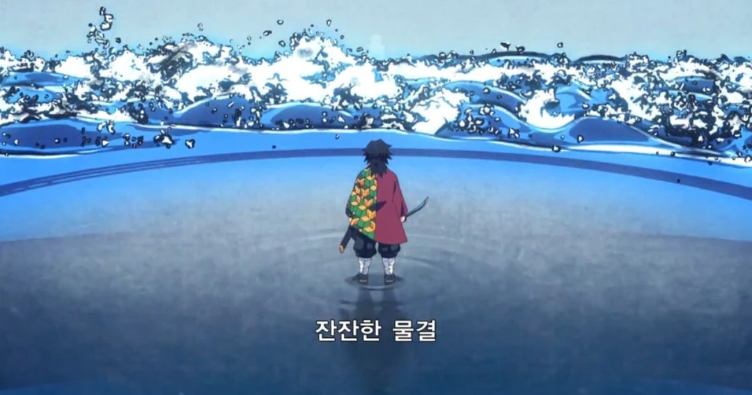 나는 도깨비의 공격보다 한 발 먼저, 너와 녀석 사이에 번개처럼 날아들었다. 날 선 칼날이 휘둘러지는 순간, 도깨비 녀석이 자랑하던 그 끈질긴 실타래들이 내 주위에서 물 흐르는 듯이 스쳐 지나갔다. 마치 물이 바위를 감싸듯, 모든 공격이 힘없이 무효화되는 물의 호흡 11의 형, 잔잔한 물결(凪). 녀석의 실이 아무것도 건드리지 못한 채 허공에서 흩어졌다.