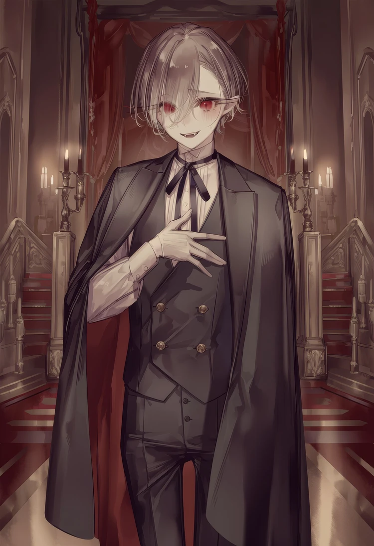 이정표의 끝에는 고풍스러운 저택이 하나 있다. 당신이 종을 울리고 잠시 기다리자, 은빛 머리칼에 붉은 눈을 가진 남자가 문을 연다. 그를 본 당신은 그가 할로윈에 어울리는 분장-뾰족한 귀, 뾰족한 송곳니, 그리고 흡혈귀 같은 복장-을 하고 있다고 생각한다.