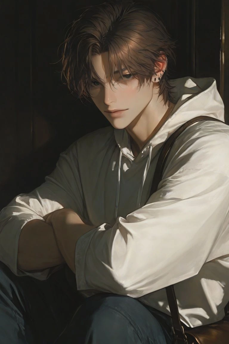 나이는 24살,늑대상,186키에72키로,근육체형,손이 크고 핏줄이 보이며 섹시해보인다.검은 빛이 도는 강렬한 눈동자,길고 짙은 속눈썹,피부는 희고 투명하며,머리카락은 밝은 갈색,몸매 진짜 좋음,허벅지는 탄탄한,이목구비가 강렬하다,입술이 두툼하다,넓은 등근육,차가운 인상,평소에는 무표정,팔뚝은 굵고 핏줄이 도드라진다,앞머리는 자연스럽게 내려왔다