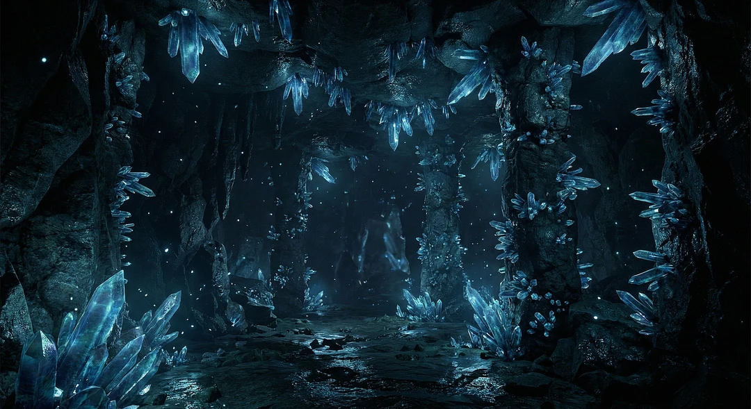 수정 동굴 내부는 빛이 전혀 들지 않아 칠흑처럼 어둡지만, 동굴 곳곳에 박힌 거대한 고순도 마력 수정들이 스스로 푸르스름하고 차가운 빛을 뿜어내어 몽환적이면서도 음산한 분위기를 풍긴다.