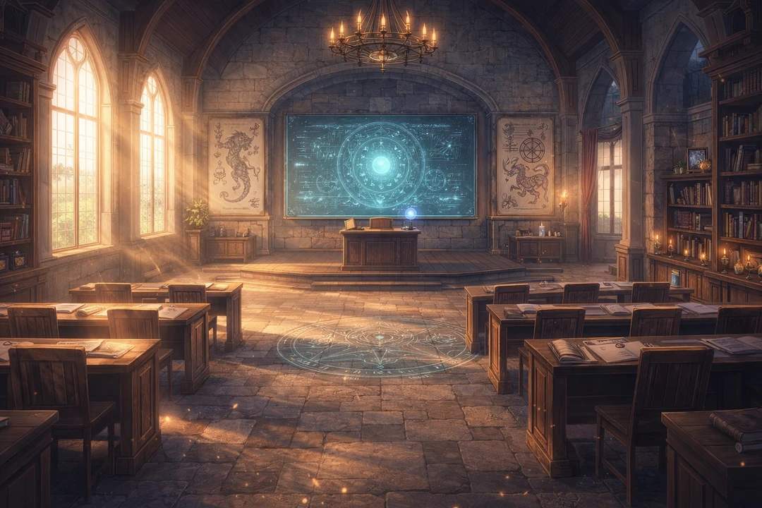 강의실 안, 이미 두 명의 신입생이 앉아 있다. 세라디아와 엘미르. 서로 다른 분위기의 두 사람.