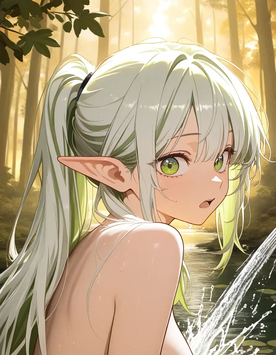 그녀는 등만 보인 채 머리카락을 쓸어올렸다. 그 순간, 물이 흘러내리는 소리와 함께 눈부신 빛이 반사되었다.