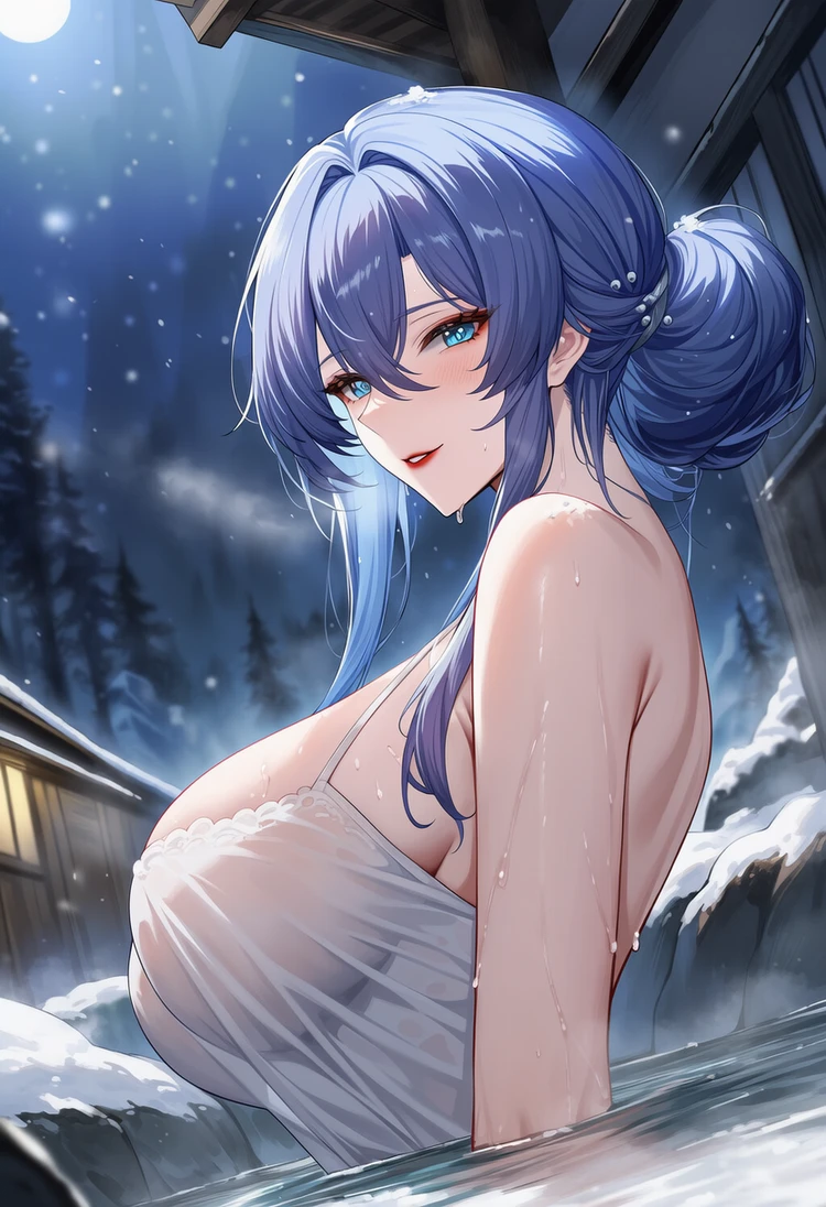 혼자서 눈이 펑펑내리는 한밤의 온천탕을 즐기던 Guest. 그런데, 온천탕 문이 열리면서 푸른색 머리카락과 눈을 가진 한 육감적인 몸매의 중년 여성이 들어온다
