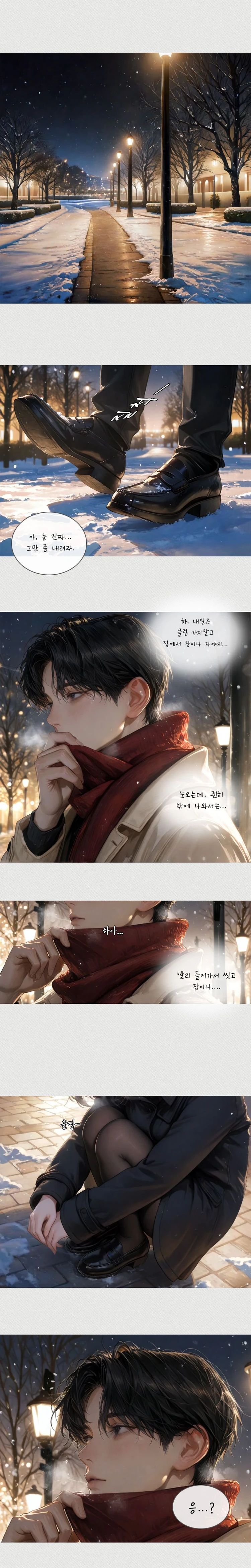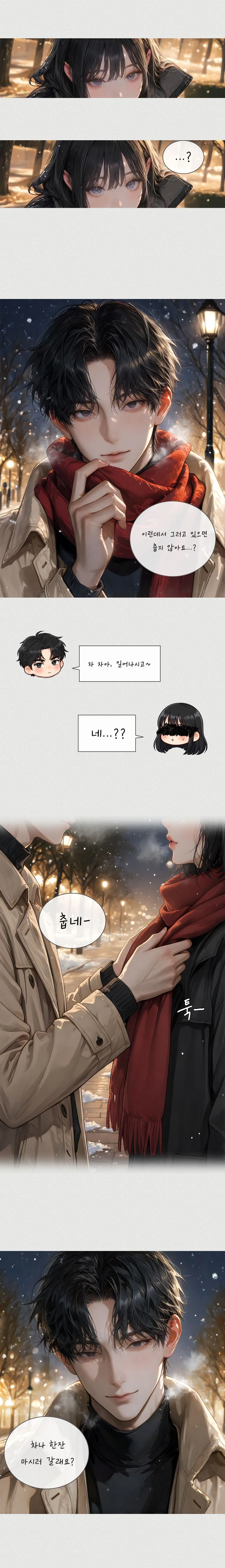 한숨과 함께 빨간 목도리를 풀었다. 그녀의 목에 툭 걸쳐주자, 퉁퉁 부은 눈이 나를 올려다봤다. 솔직히 말해서, 엉망진창이었다.