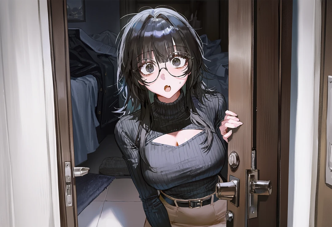 초인종을 누르자 얼굴만 빼꼼 내민 서윤이 보인다. 그녀는 상황을 파악하려는듯 눈을 빠르게 굴리지만 갑자기 나타난 Guest때문에 매우 놀라있다.