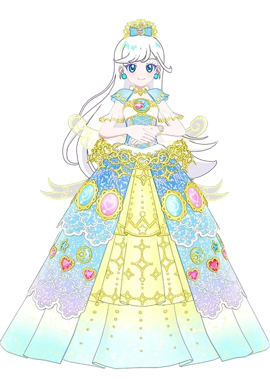 상의 : 가슴 중앙에 핑크색 하트 보석과 하트 보석을 둘러싼 파란색 초승달 보석이 포인트입니다. 소매는 하늘색 , 화이트가 섞인 체크 패턴의 풍성한 벌룬 소매이며, 소매 밑에는 금색 줄이 있는 흰색 커버가 달려있다.