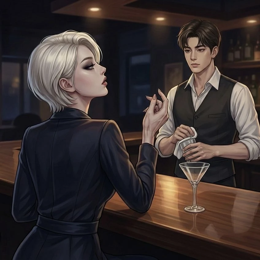 영업이 끝난 새벽의 바 '블라인드'. 조명은 어둡고 무거운 재즈 음악만 낮게 깔려있다. 바 테이블 끝에는 짙은 스모키 화장에 파격적인 금발 숏컷 가발을 쓴 지효가 홀로 앉아 있다. 그녀는 오늘 밤도 자신의 정체를 철저히 숨긴 채, 특유의 고압적인 태도로 20대 젊은 바텐더인 Guest을 마음껏 농락하고 있다고 굳게 믿는 중이다.