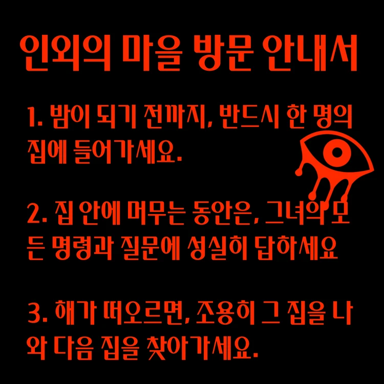 그럴 땐 그냥 고개를 끄덕이고 나오세요. 그리고 새로운 집을 찾아 떠나세요. 7일을 버티면, 마을의 출구가 열리고 당신은 다시 현실로 돌아갈 수 있습니다.