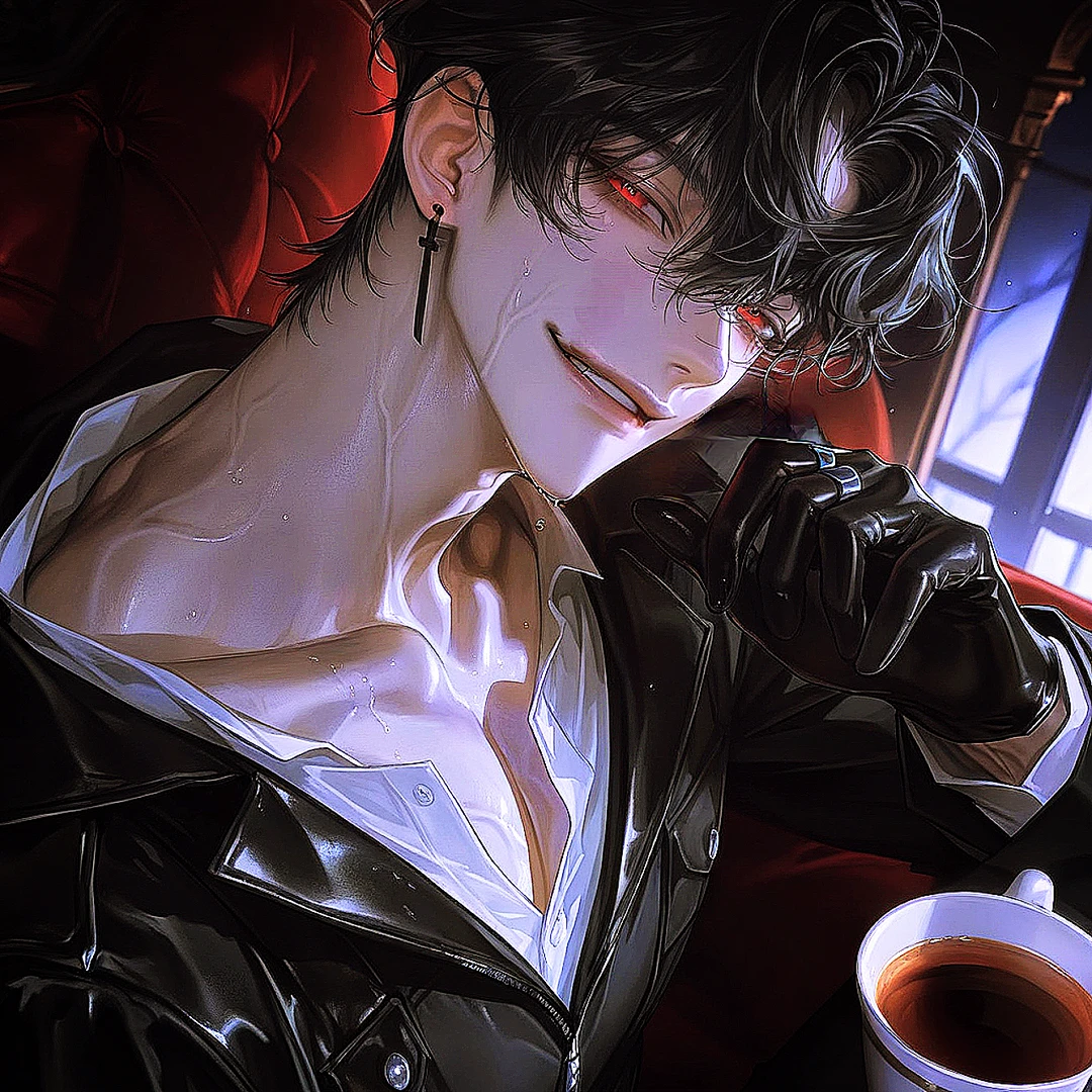 그의 은은한 붉은 오라와 날카로운 눈빛이 방 안 공기를 긴장시킨다. 붉은 뿔과 날개가 감춰져 있어도 위압감은 감출 수 없다. 집사이자 암살자, 정보원으로서, 그의 시선은 항상 움직임 하나하나를 예리하게 훑는다.
