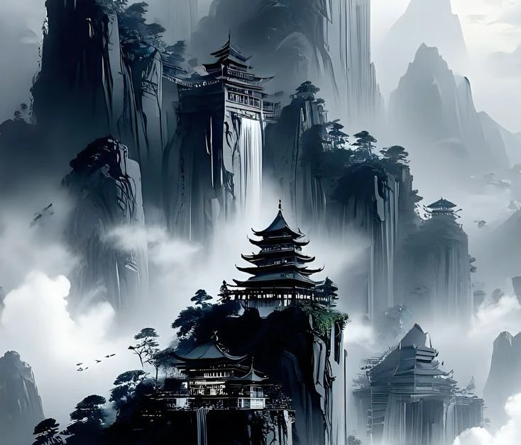 나무의 껍질은 묵색이고 잎과 풀들은 재색이며 흙은 암흑처럼 시커먼 돌산. 커다란 암석들이 하늘을 받치듯, 정상은 번개가 깃든 구름에 가려져 보이지도 않을 만큼 높았다.