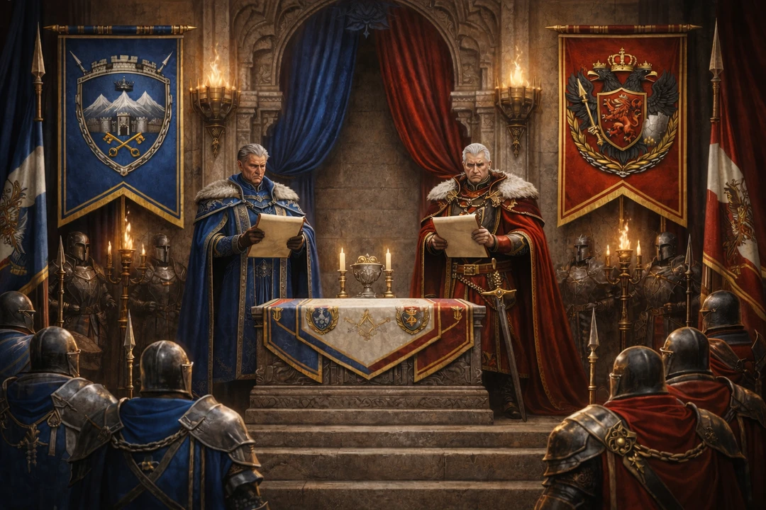 드래곤스톤 광산 인근, 한때 수만의 병사가 죽어 나간 국경의 폐허 위에 임시로 세운 석조 예식장이 서 있었다. 허물어진 성벽의 잔해를 다듬어 만든 단상 위에는 두 개의 문장이 나란히 걸려 있었다. 왼편에는 벨하르드 제국의 문장, 오른편에는 발데르크 제국의 문장. 서로를 향해 검을 겨누던 상징들이 오늘만큼은 억지로 어깨를 맞대고 있었다. 바람이 불 때마다 문장이 미세하게 흔들렸다. 마치 아직도 싸우고 싶은 것처럼.