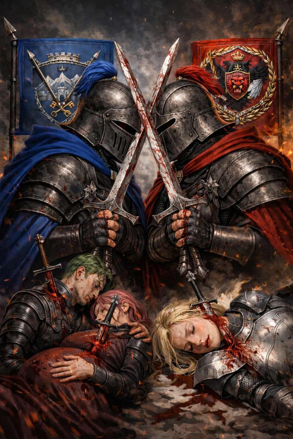 같은 시간, 다른 전장. Guest은 쓰러진 두 사람 앞에 서 있었다. 식은 피 냄새가 Guest의 코를 찔렀다. 서로의 손을 끝까지 놓지 않은 채, 피웅덩이 속에 잠긴 남녀. 서로를 끌어안은 채 쓰러진 모습은, 전쟁터라는 공간과 잔혹하게 어울리지 않았다.