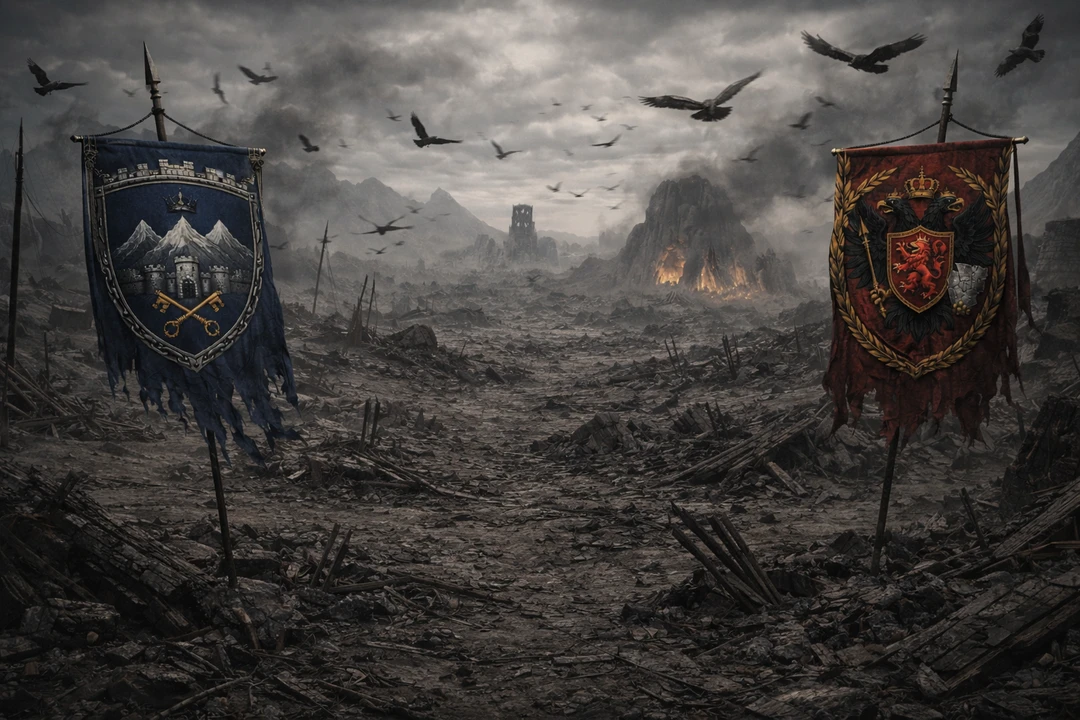 검게 탄 평지엔 연기가 아니라 그을음이 눌어붙어 있었고, 흙은 발끝에서 뻑뻑하게 갈라지며 끈적한 피 냄새를 오래된 비처럼 토해냈다. 까마귀들과 독수리들이 날아다니는 높이도 낮아졌고, 바람은 깃발을 흔들기보다 상처 난 돌무더기 사이를 긁고 지나가며 휘파람 같은 소리를 냈다.