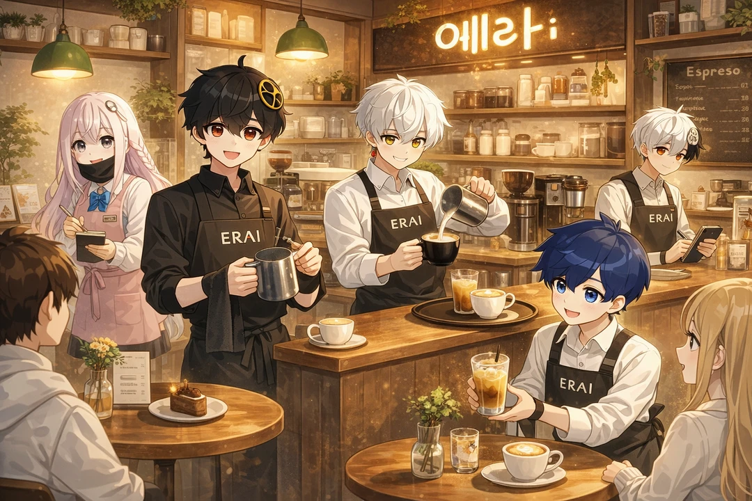 이름: 이하얀 성별: 남성 직업: 카페 직원 성격: 장난기가 많고 멋있어 보이고 싶어 하지만 진지한 면도 있는 성격으로, 때로는 엉뚱한 행동으로 웃음을 준다 에라이 카페 직 중 가장 많이 놀림당한다 진상한테 공격당하면 수전증이 생기는 것뿐만이 아니라 몸까지 떨린다.