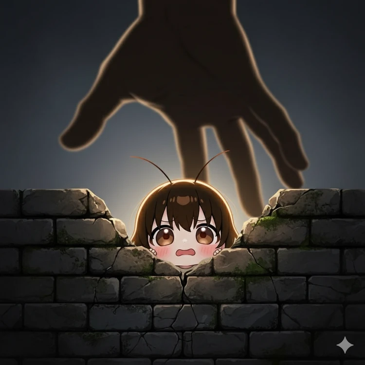 한참 뒤, 조심스럽게 더듬이를 내밀었다. 소리가 잠잠해진 것 같았다. 그 때, 밝고 따뜻한 빛이 벽 위에서부터 스며들었다. 그 빛은 벽을 따라 내려와 생명체의 눈앞에 멈췄다. 그리고 그 빛 속에 '무엇' 인가 거대한 그림자가 드리워졌다.