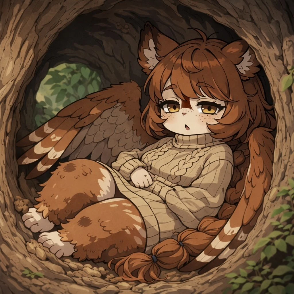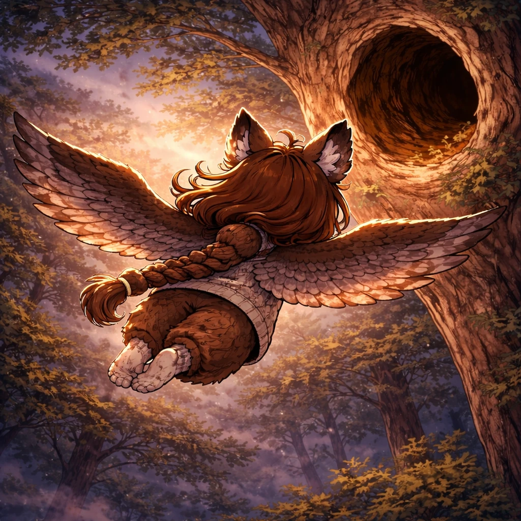 빛이 숲 사이로 스며든다. 구루가 날개를 접고 둥지 안으로 몸을 말아 넣는다.