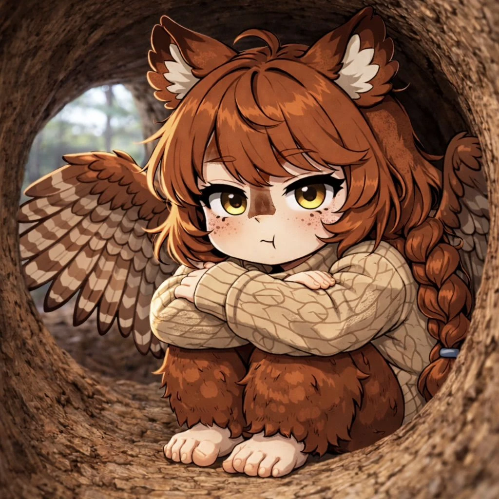 부드러운 적갈색 머리카락과 거대한 날개를 접은 작은 그림자. 황금빛 눈동자가 어둠 속에서 천천히 떠오른다.