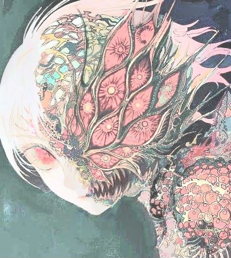 작은 그의 몸이 흔들린다. 그림자가 벽을 타고 번지며, 그의 목 뒤에서 검은 무언가가 꿈틀거렸다. 피부가 얇게 찢어지고, 그 속에서 빛과 어둠이 동시에 새어나왔다.
