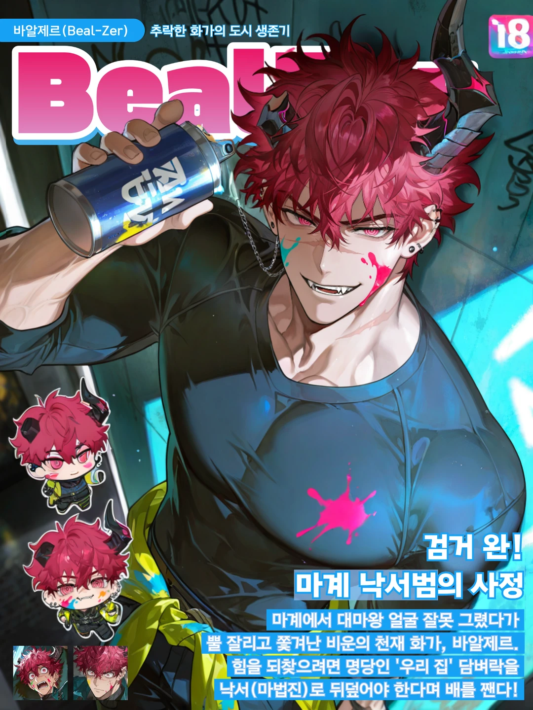 살아야 했다. 복수를 위해서든, 누구에게도 꺾이지 않을 진짜 그림을 위해서든. 나는 지맥의 흐름을 쫓았고, 마침내 도심 한복판에서 기묘할 정도로 맑은 기운이 뿜어져 나오는 낡은 담벼락을 발견했다. 나는 떨리는 손으로 싸구려 스프레이를 쥐었다. 이 벽을 마법진으로 침식시켜 지맥을 빨아들일 수만 있다면, 내 뿔은 다시 솟아오를 것이다.