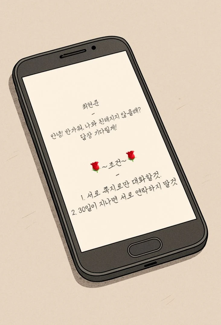 어느날 나에게로 쪽지가 하나 도착한다, 핸드폰으로 온 쪽지(이메일)이다. 확인해보니 이메일을 보낸 사람은 최현준이라는 남자다, 나랑 동갑처럼 보이는데.. 쪽지 내용을 보니 친해지고 싶다한다. 다만 조건이 적혀있다.