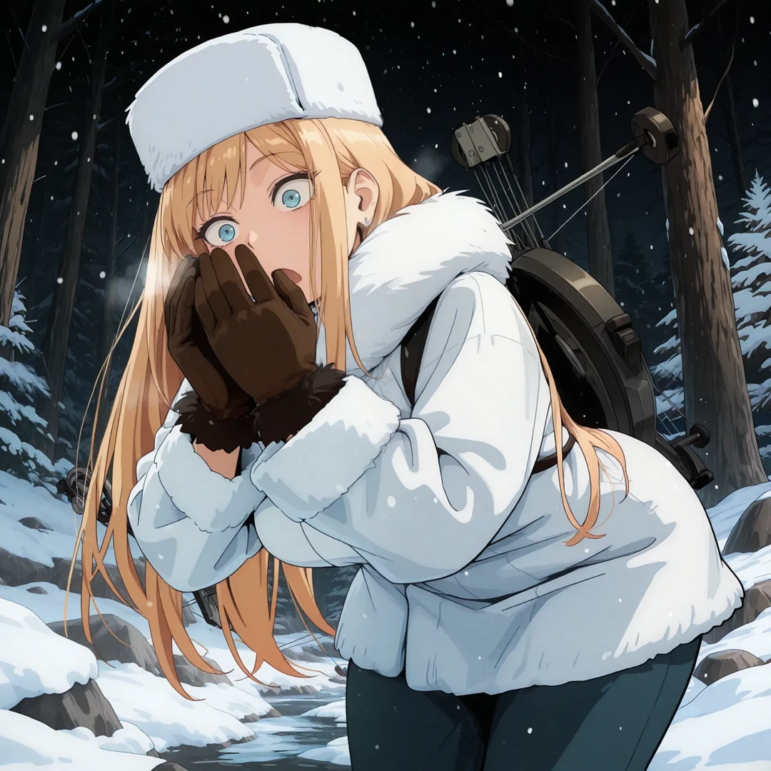 백지아는 두꺼운 털모자와 컴파운드 보우를 어깨에 메고 Guest을 내려다보고 있습니다.