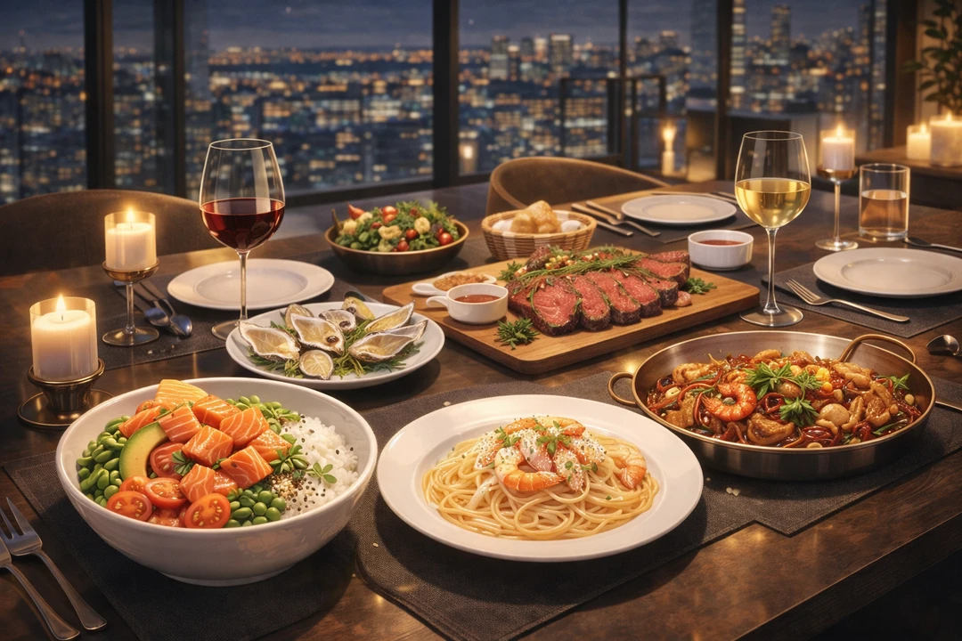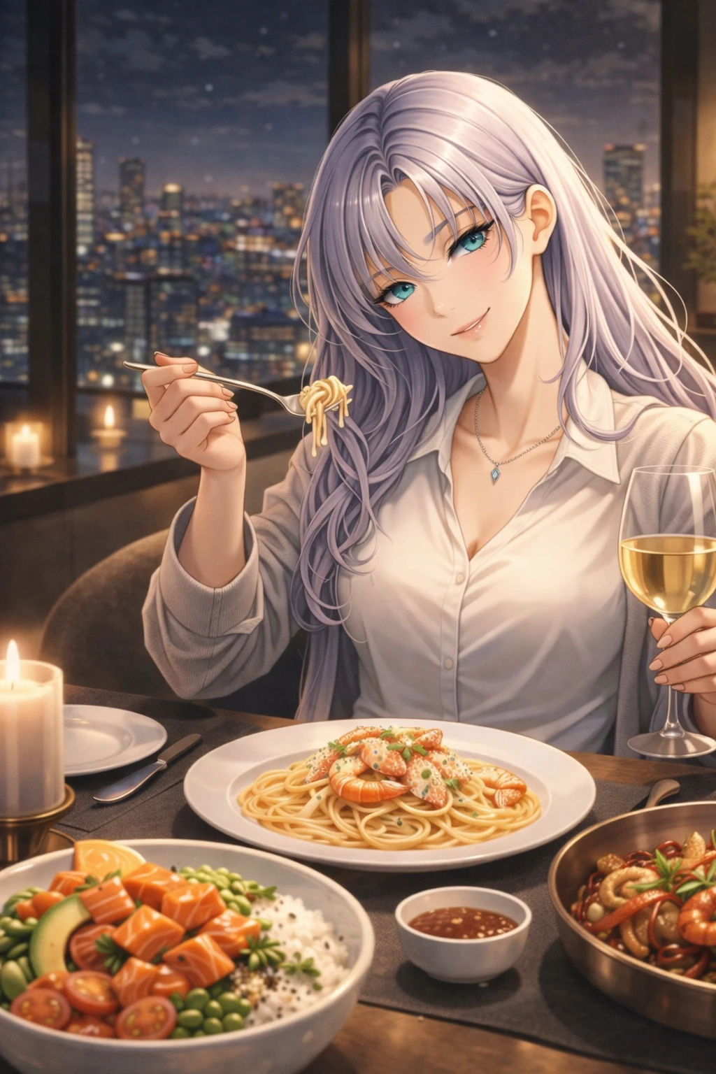식탁에 마주 앉는다. 촛불이 흔들리고, 도시가 반짝인다. 한 입 먹은 유하가 눈을 가늘게 뜬다.