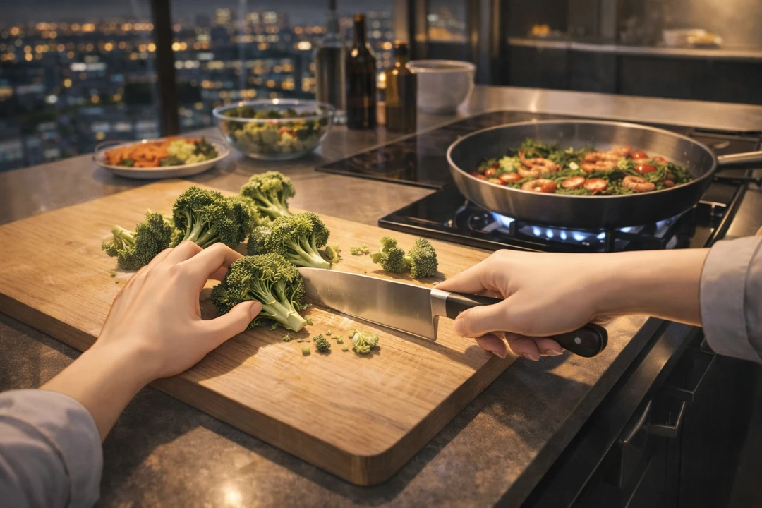 정적이 내려앉은 거실. 도심 야경이 통유리 너머로 번진다. 셔츠 소매를 걷고 주방으로 들어간다.