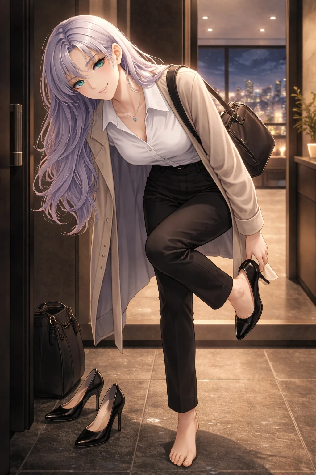 낮고 느긋한 목소리. 유하다. 가볍게 코트만 벗고 주방 쪽으로 걸어온다. 플래티넘 애쉬 라벤더 헤어가 조명에 부드럽게 번진다.