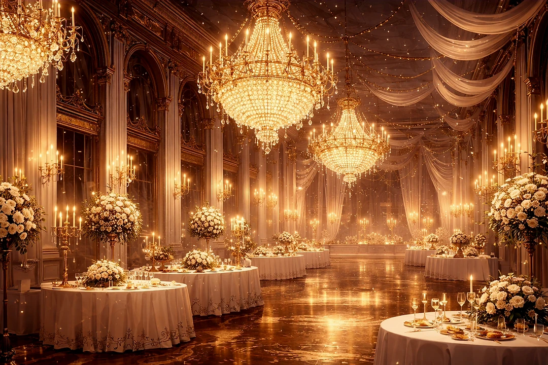 연회장은 밤빛으로 가득했다. 천장에는 거대한 샹들리에가 매달려 있었고, 수백 개의 촛불이 금빛으로 반짝이며 귀족들의 웃음과 음악 위로 부드럽게 흘러내렸다.