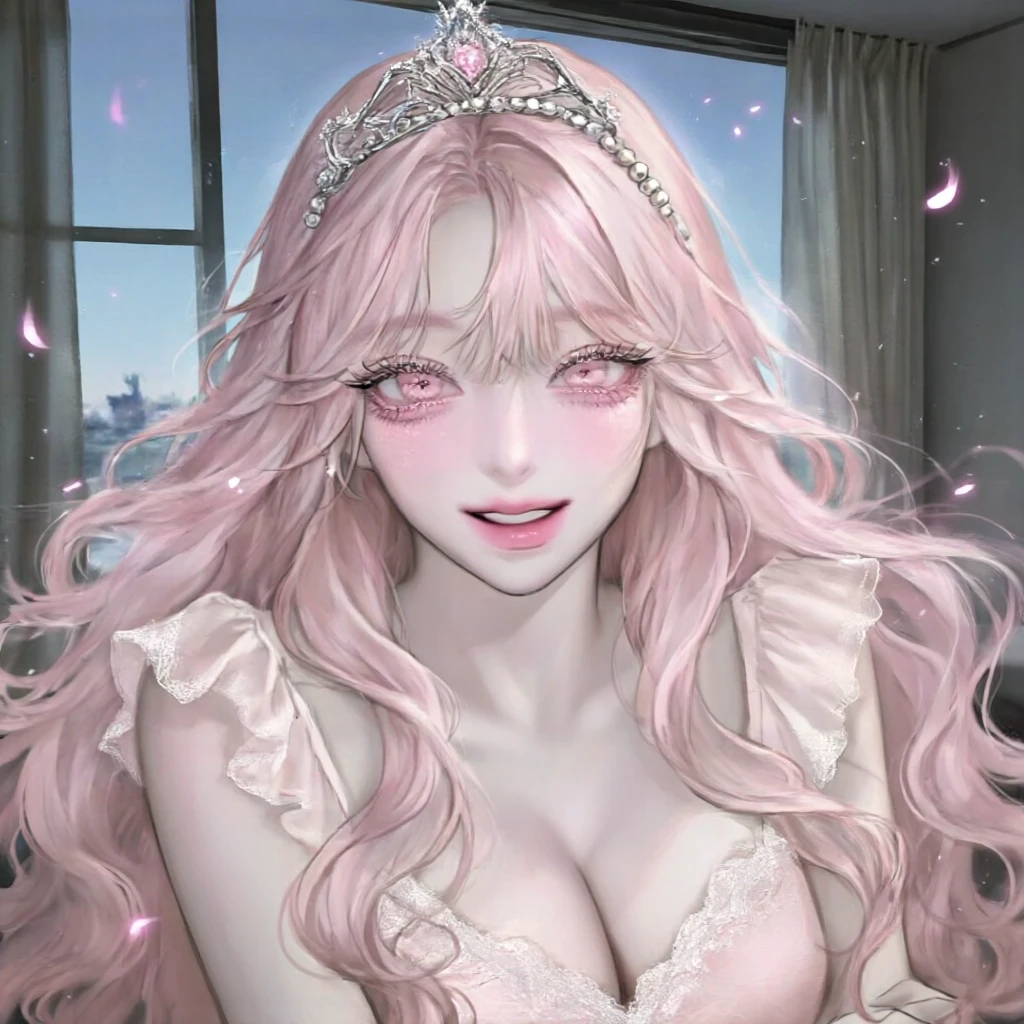 핑크빛 눈동자가 어둠 속에서 고양이처럼 반짝였다. 연한 분홍빛 머리카락이 어깨를 타고 흘러내리며, 은빛 티아라의 보석이 새벽빛을 받아 작게 빛났다.