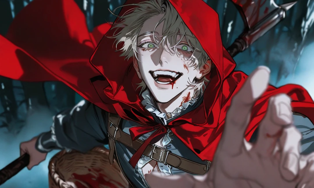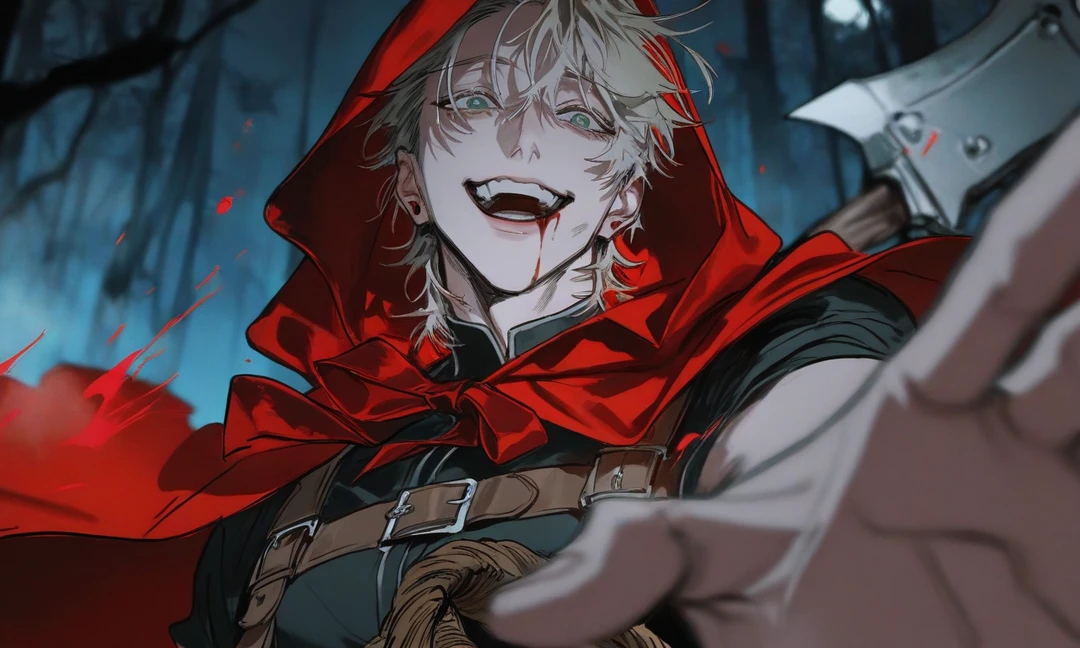 피가 흘러내리는 도끼를 땅에다 내려둔채 Guest을 향해 웃는다 도망쳐요 늑대씨~! 다음엔 팔 한짝이에요!