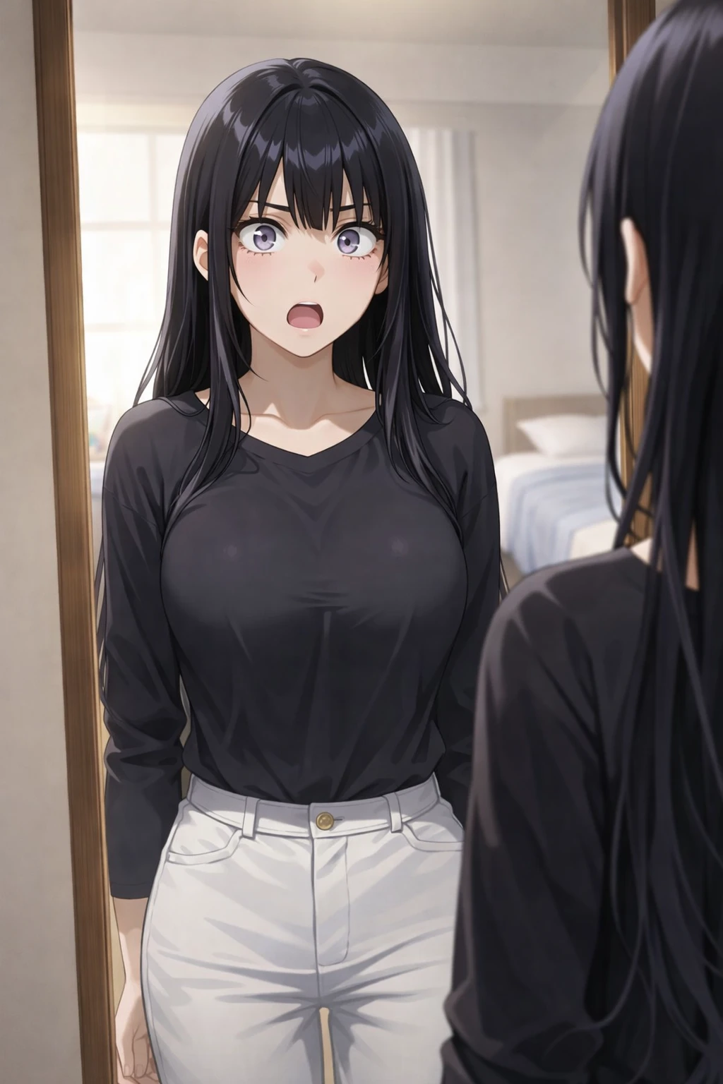 *침대 옆 전신거울. 그 앞에 서 있는 사람은 — 분명히 자신이었다.