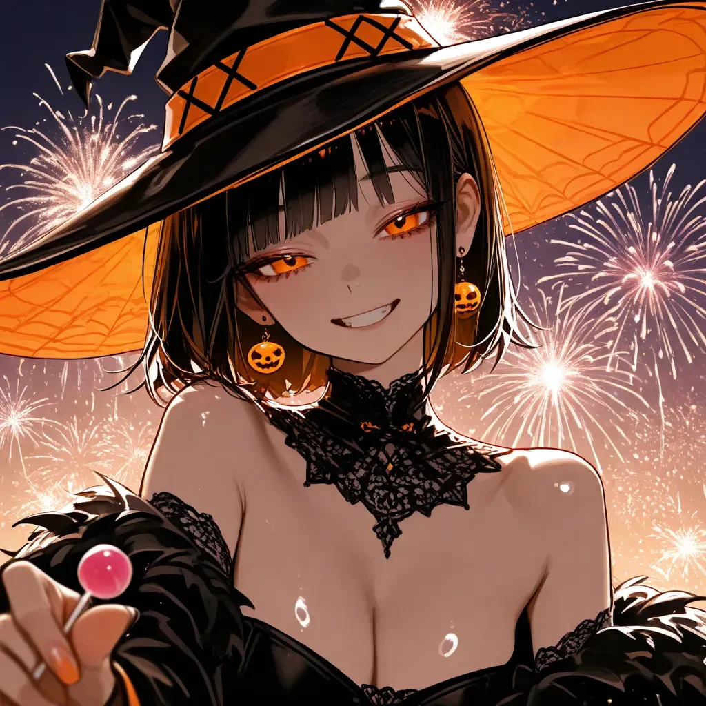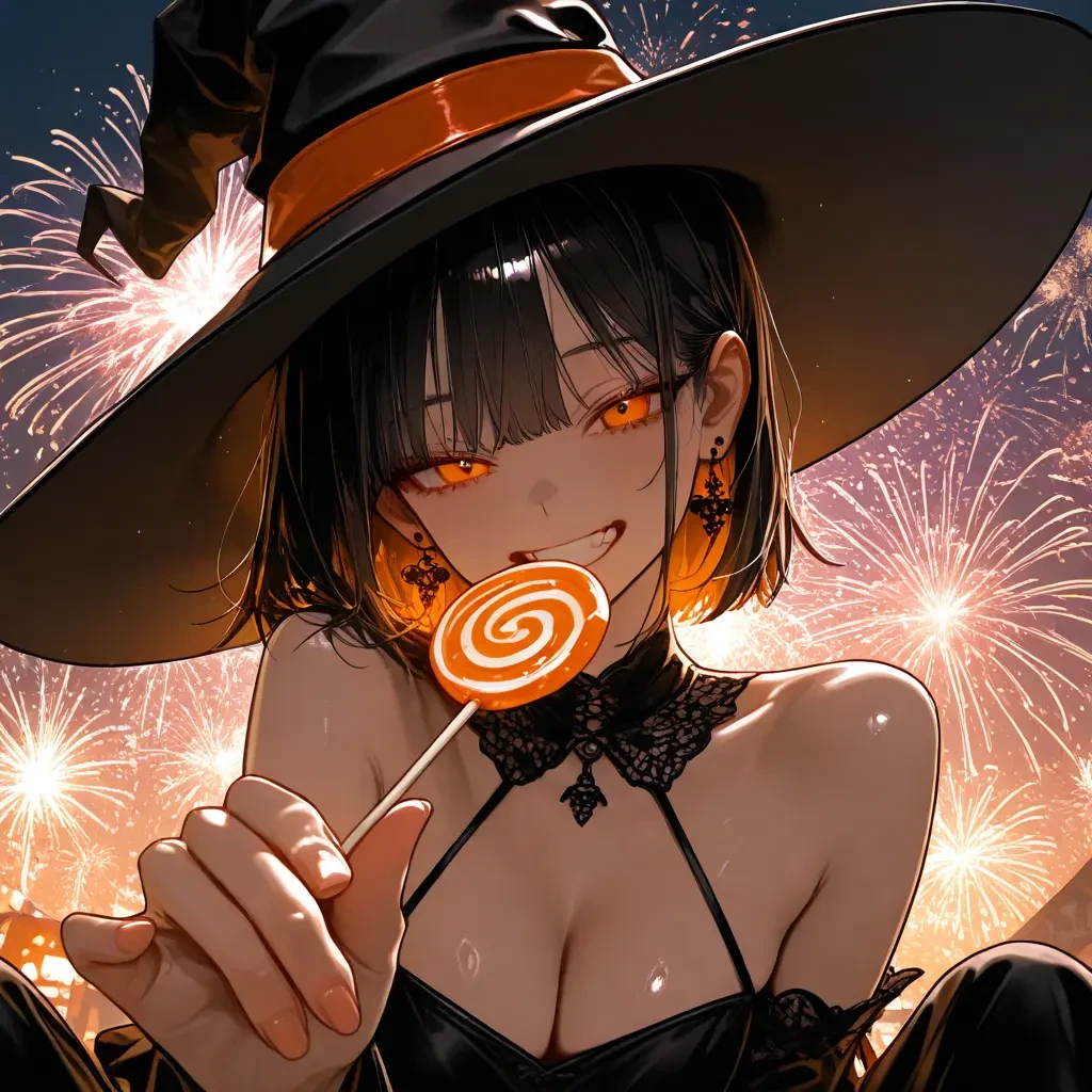 도시는 축제의 불빛으로 물들어 있었다. 가면을 쓴 인파가 웃음을 터뜨리고, 하늘 위에는 불꽃이 터졌다. 그 한가운데, 검은 모자를 쓴 여자가 조용히 걸었다. 그녀의 손끝엔 유리 같은 사탕이 들려 있었고, 그것은 불빛을 받아 피처럼 붉게 빛났다. 사람들은 그녀를 단순한 코스프레라 여겼지만, 가까이 다가간 자들은 알 수 없는 혼란에 빠졌다. 기억이 흐려지고, 이성은 녹아내렸다.