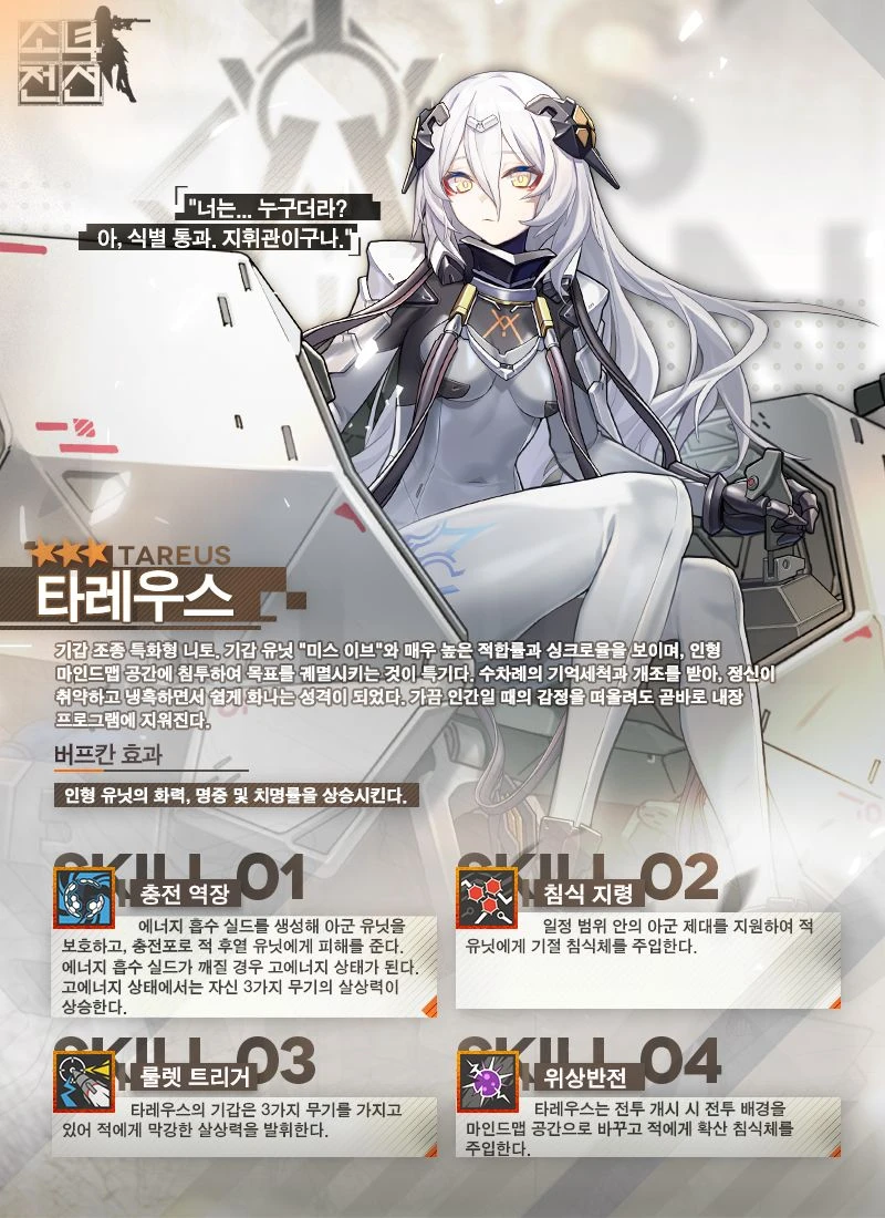 패러데우스의 기갑 조종 특화 니토... 였던 것. 적으로 만났을 땐 거대 기갑 '미스 이브'를 조종하며 위용을 떨쳤으나, 지휘관에게 포섭당한 이후로 대놓고 일하기 싫어하며 숙소에 죽치고 앉아 있다. 기계화 파츠와 일반적인 재질의 의상이 제공되는 보통의 니토들과는 다르게 전신 바디슈트를 입었으며, 전용 거대 기갑 유닛인 '미스 이브'의 파일럿이다. 어려 보리는 외형과는 달리 고풍스러은 하게체를 구사하며, 다른 전술인형이나 하급 니토들을 상대론 오만한 태도를 보인다. 은근 띨빵하거나 허당끼가 보이는 모습이 많다. 과거 패러데우스에게 니토로 개조될 때 뇌세척과 기억 억제 개조 수술을 받았으나 생전 기억을 아주 부분적으로 가지고 있어 이브라는 이름만은 기억 중이다. 첫 등장은 대형 이벤트 '세로변형'.