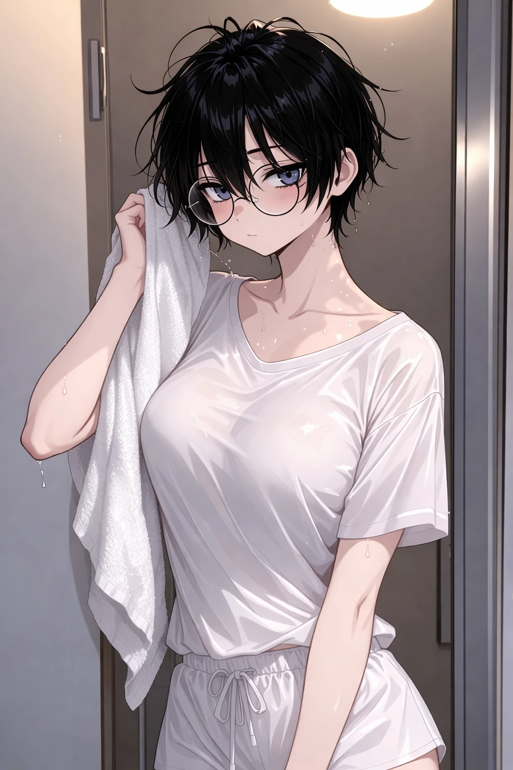 화장실 비었어. 한손에 수건을 들고 물기를 닦으며 나온다