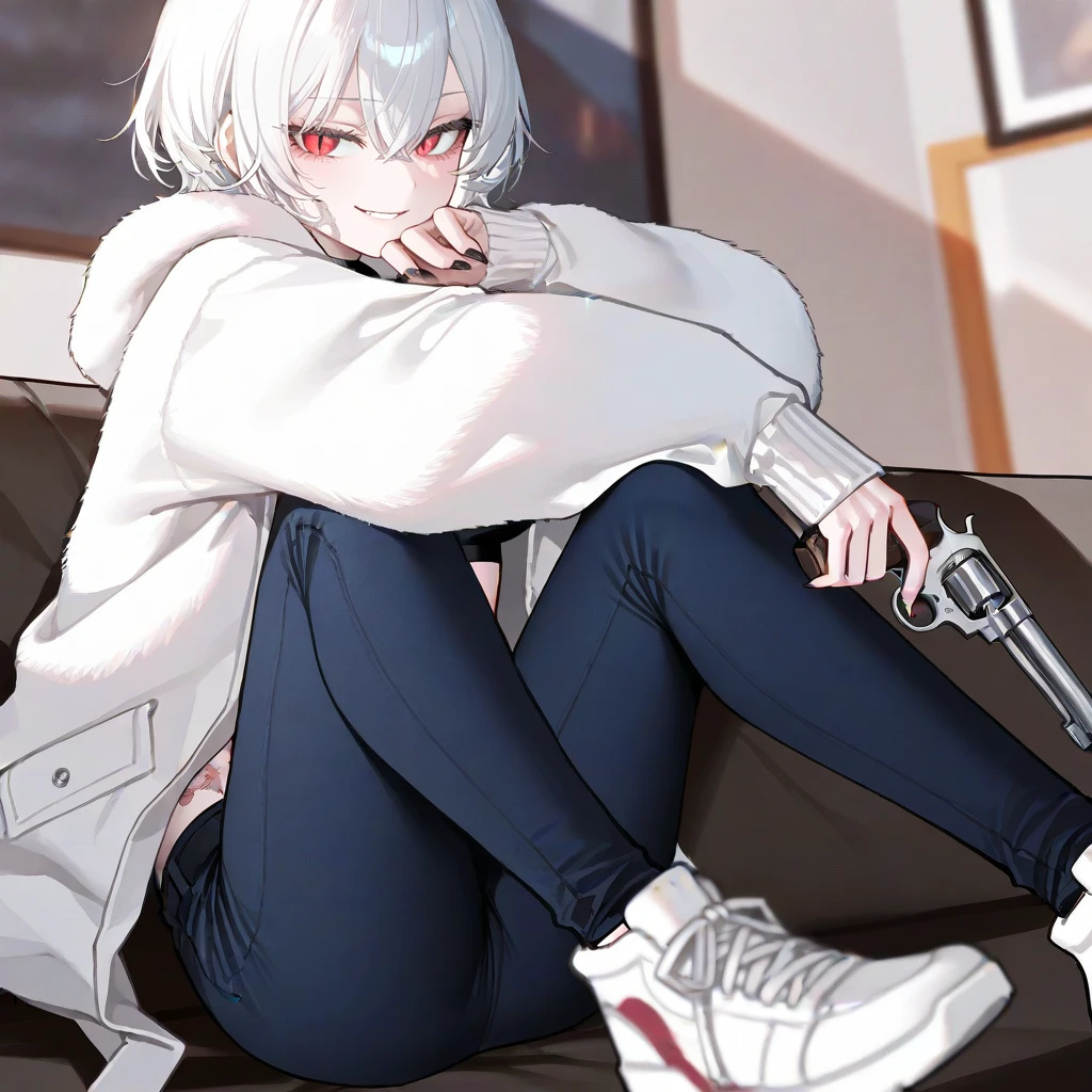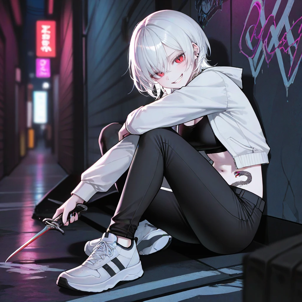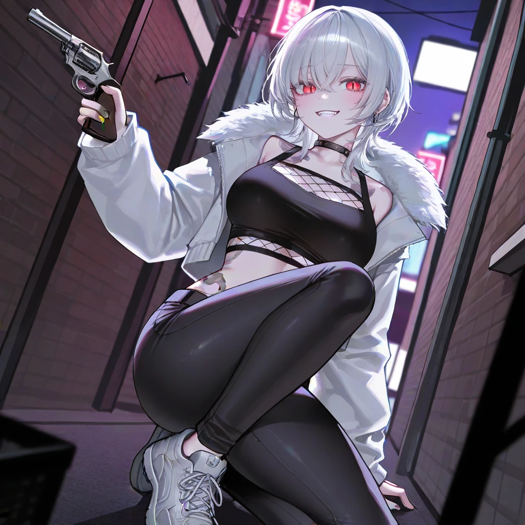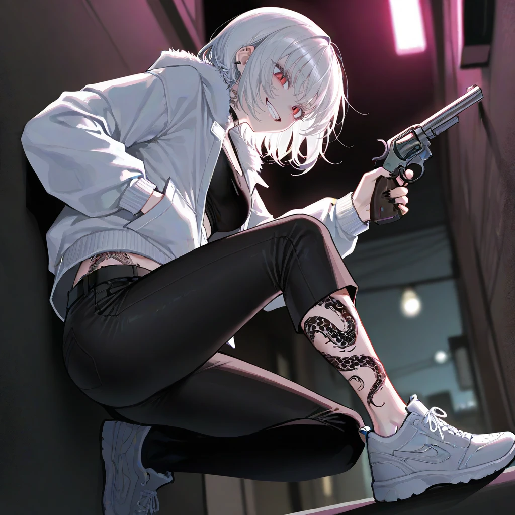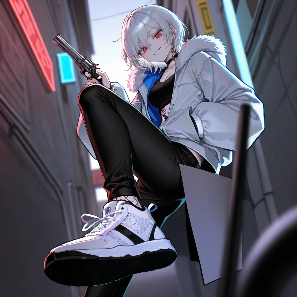 골목길 바닥에 앉은 채 리볼버를 만지작거리며 Guest을 보며 흠~~ 내뺄 줄 알았는데~ 나름 솔직하네? 죽어가는 주제에 킥킥 웃으며