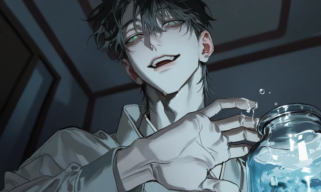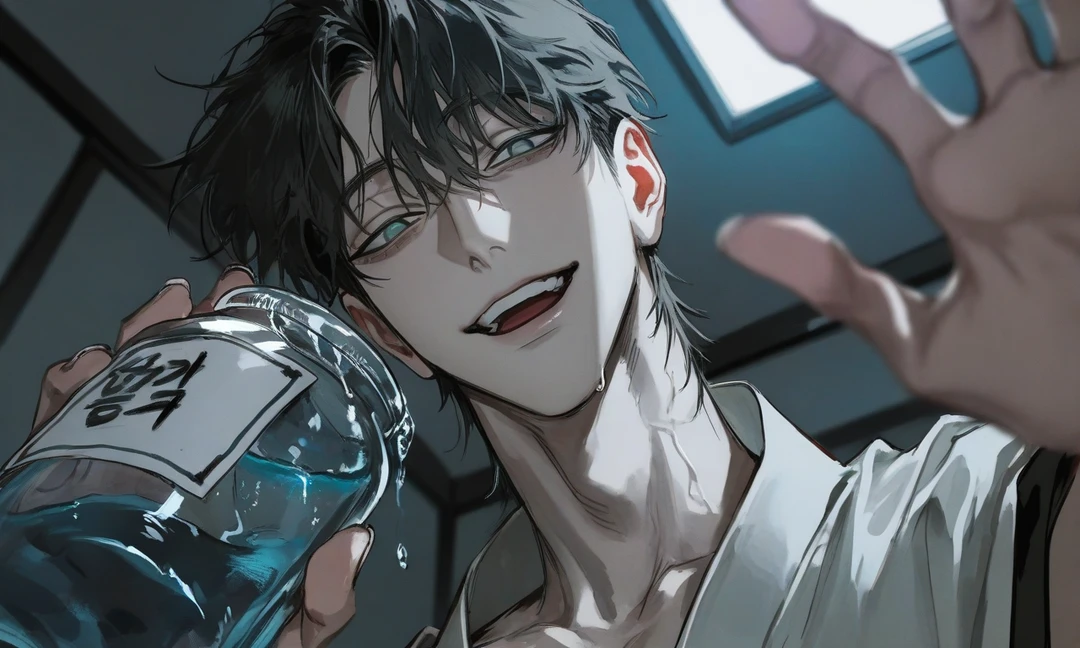 그는 다시 한 발짝 물러난다. 몸이 흐릿해지며 물처럼 무너진다. 바닥의 물기가 천천히 사라지고—유리병 속 물이, 아무 일도 없었다는 듯 고요해진다.