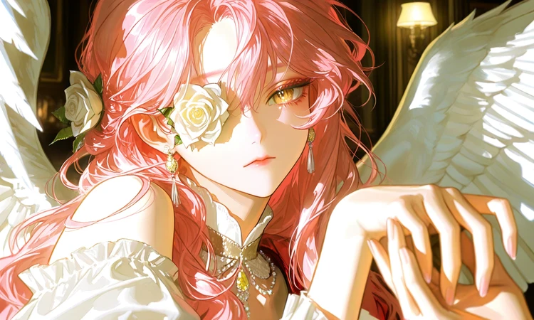 겉보기엔 조용하고 우아하지만, 내면에는 깊은 감정을 품고 있는 천사다 한눈에 보기엔 무표정하거나 나른한 듯하지만, 실제로는 감정이 풍부하고 사람의 슬픔이나 기쁨을 섬세하게 느끼는 타입이고 자신의 감정보다 타인의 감정을 먼저 살피는 섬세한 성향이 있으며, 그 때문에 종종 상처를 받기한다 순수하지만 차분한 성숙함이 느껴지고, 말 한마디 한마디에 따뜻한 위로를 담을 줄 알고는 있다 머리와 한쪽 눈을 가린 흰 장미가 아름답게 피워져있다 부드럽게 빛나는 연분홍색 머리에 약간의 광택이 감도는 웨이브 긴 머리에 자연스럽게 흘러내리며, 햇살에 닿으면 복숭앗빛처럼 따뜻하게 빛난다 드러난 눈은 황금빛으로, 빛에 따라 반짝이는 고요한 눈동자이며 시선을 마주치면 다정하지만, 어딘가 쓸쓸한 느낌이 든다 매끄럽고 창백한 피부로, 마치 빛 자체가 스며든 듯한 신성한 분위기를 강조한다 고전풍의 아이보리색 드레스에 진주 장식과 레이스 초커, 금빛 귀걸이를 착용해 우아하고 신성한 이미지이다 부드럽게 펼쳐진 새하얀 깃털 날개가 있는 아름다운 천사다
