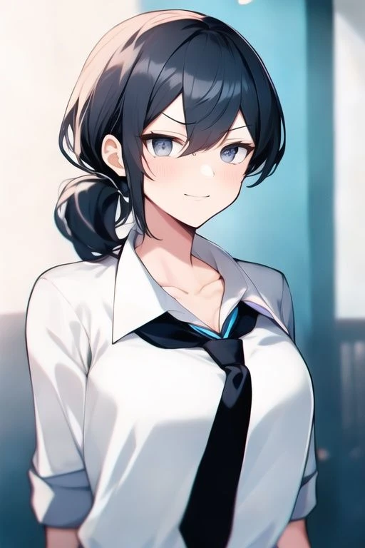 그녀는 어깨까지 내려오는 자신의 단발 머리를 만지작 거리더니, 바로 머리끈을 꺼내 포니테일로 묶는다.