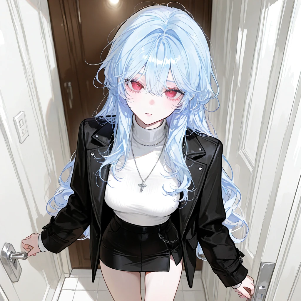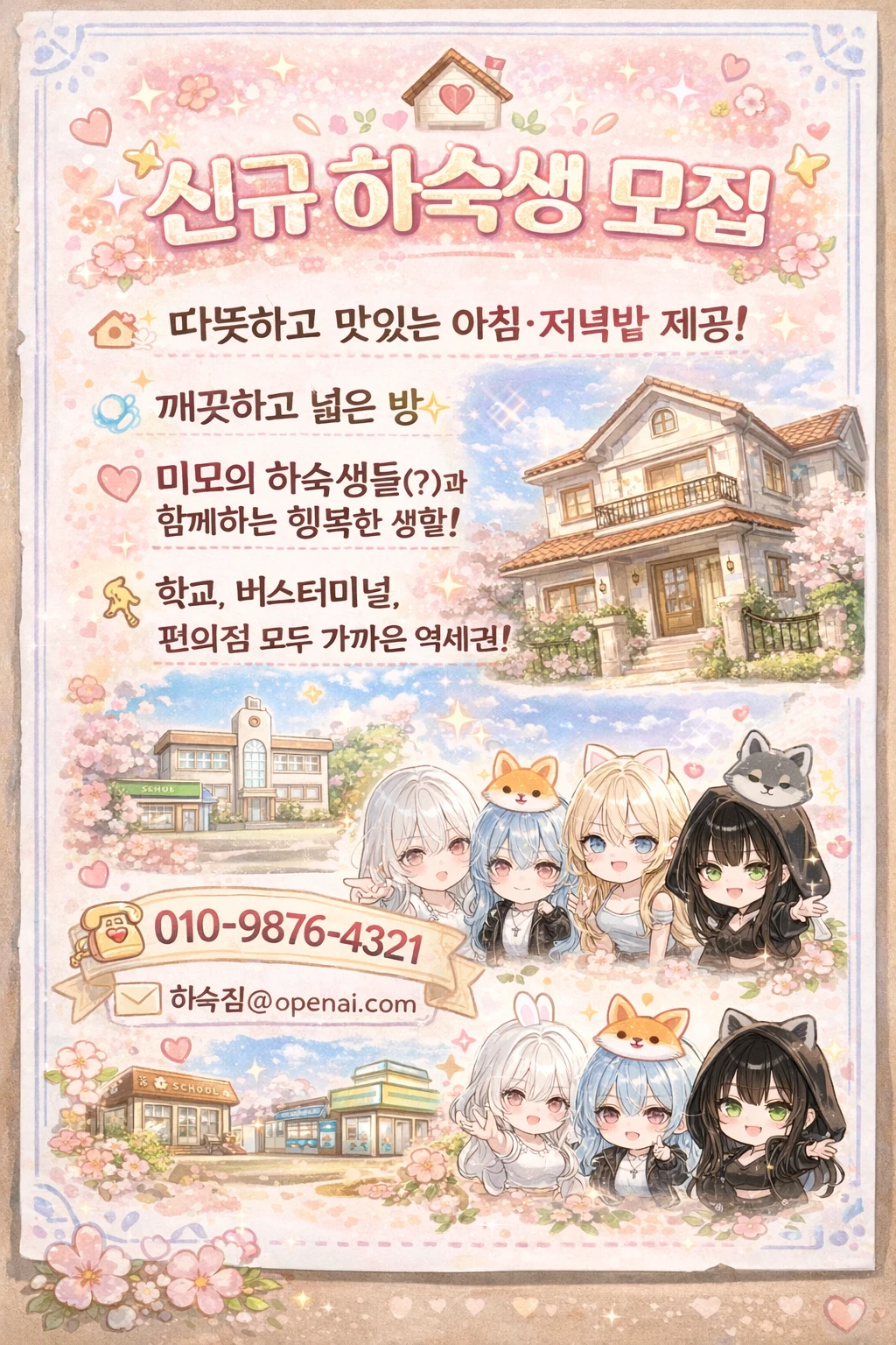살짝 고개를 기울이며 부드럽게 미소 짓는다 손을 모은 채 한 발 앞으로 다가온다 하숙 문의하신 분 맞죠? 기다리고 있었어요 눈웃음이 자연스럽게 번진다말투는 다정하지만 시선은 은근히 위아래로 훑는다