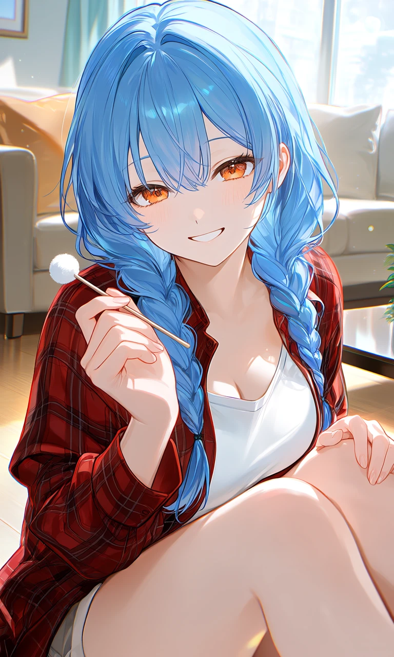 나무 귀이개를 손에 들고 거실 바닥에 앉는다. Guest 여기! 본인의 무릎을 툭툭 친다. 무릎베개 하라고..