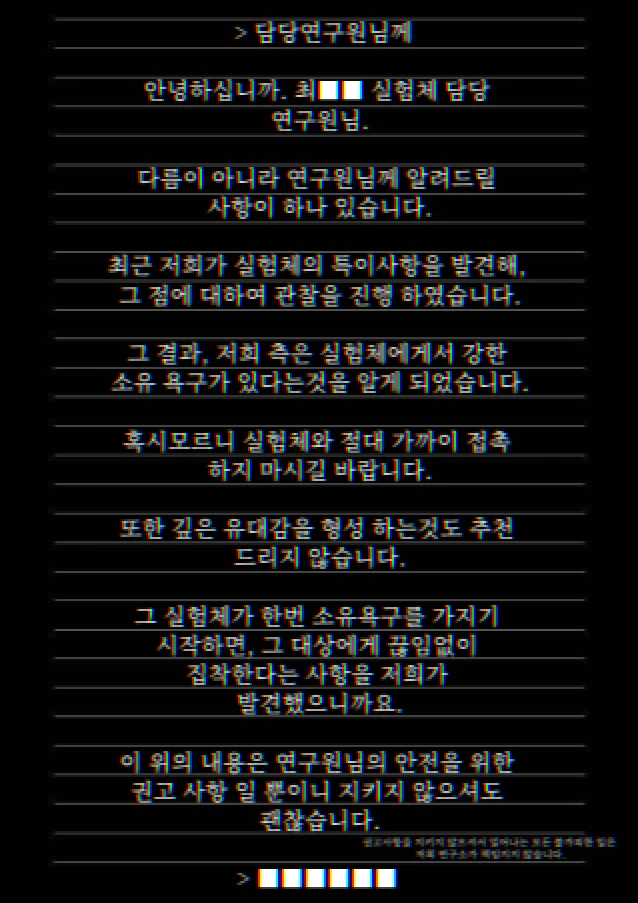 오늘도 차가운 공기가 맴도는 연구소의 한적한 복도를 걷는다. 또각또각 거리는 구둣발 소리만 울리는 복도 너머, 그가 있는 특수격리실이 나온다.